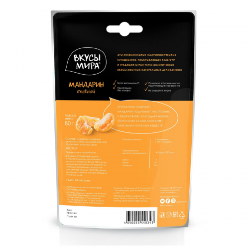 Ароматный сушеный мандарин поднимает настроение и вдохновляет. Благодаря новой технологии сушки сохраняет максимум полезных веществ. Богат витамином С. Приготовлен без сахара. Содержит эфирные масла, поднимающие настроение. Не содержит жиров. Состав: мандарин сушеный, антиокислитель лимонная кислота, консервант диоксид серы. Пищевая ценность: белки - 1,00 г, жиры - 0,00 г, углеводы - 82,00 г. Энергетическая ценность: 1410 кДж, 330 ккал. Вес: 80 г. Срок годности: 18 месяцев. Хранить в закрытом виде при относительной влажности воздуха не более 75% в чистых, хорошо вентилируемых помещениях, не имеющих постороннего запаха, при температуре не выше +25°С (без резких колебаний). Избегать прямого попадания солнечных лучей. Страна производства: Тайланд.