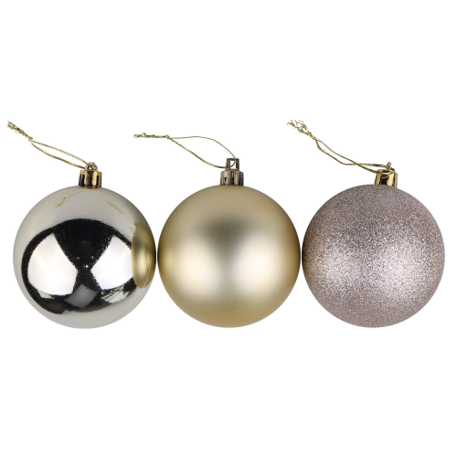 Набор поможет преобразить интерьер, наполнить его сладостной атмосферой наступающих зимних праздников. Елочные шары - непременный атрибут Нового года. Цвет "светлое золото" в сочетании с отделкой разной фактуры создадут праздничное настроение.