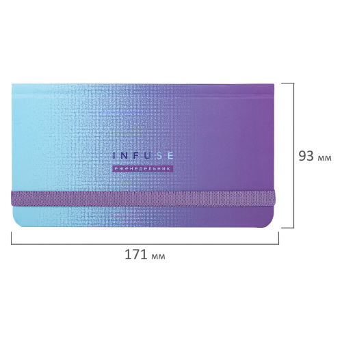 Внутренний блок содержит 64 листа офсетной бумаги белого цвета плотностью 65 г/м2. Обложка 7БЦ (твердый переплет с матовой пленкой и выборочным лаком) обеспечивает долгий срок службы. Снабжен резинкой-фиксатором, благодаря чему планинг-еженедельник не откроется в сумке или портфеле. Отличительная особенность - это поля, где можно проставить даты. Размер изделия - 171х93 мм.