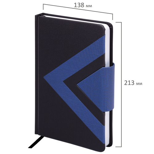 Внутренний блок включает 160 листов белой бумаги плотностью 70 г/м2. Каждая страничка имеет перфорированный угол. Благодаря стандартному формату А5 (138x213 мм) ежедневник удобно использовать как в офисе, так и на выездных деловых встречах. Твердая обложка, стилизованная под гладкую кожу, подходит для горячего тиснения. Снабжен магнитной застежкой, благодаря чему ежедневник не откроется в сумке или портфеле. Форзац ежедневника представлен картами мира и России. Дополнением является закладка-ляссе, с помощью которой при необходимости можно быстро открыть ежедневник на нужной странице. Помимо прочего ежедневник снабжен справочным материалом. Выполнен в комбинации из двух цветов - синий и черный.