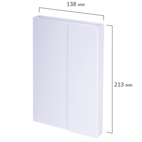 Внутренний блок включает 160 листов белой бумаги плотностью 70 г/м2. Каждая страничка имеет перфорированный угол. Твердая обложка, выполненная в классическом белом цвете и стилизованная под гладкую кожу, фиксируется магнитным клапаном, поэтому ежедневник не откроется в сумке или портфеле и страницы не помнутся.
