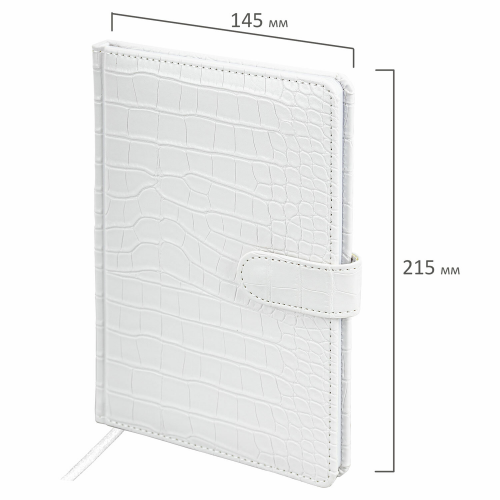 Внутренний блок включает 64 листа тонированной бумаги плотностью 70 г/м2. Благодаря стандартному формату А5 еженедельник удобно использовать как в офисе, так и на выездных деловых встречах. Твердая обложка, стилизованная под кожу крокодила, фиксируется магнитной застежкой, поэтому еженедельник не откроется в сумке или портфеле и страницы не помнутся. Подходит для горячего тиснения. Дополнением является закладка-ляссе, с помощью которой при необходимости можно быстро открыть еженедельник на нужной странице. Помимо прочего, еженедельник снабжен обширным справочным материалом. Выполнен в белом цвете.