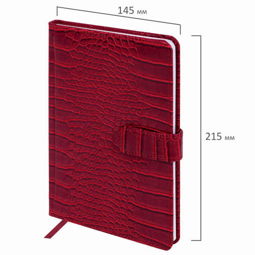 Внутренний блок включает 64 листа тонированной бумаги плотностью 70 г/м2. Благодаря стандартному формату А5 еженедельник удобно использовать как в офисе, так и на выездных деловых встречах. Твердая обложка, стилизованная под кожу крокодила, фиксируется магнитной застежкой, поэтому еженедельник не откроется в сумке или портфеле и страницы не помнутся. Подходит для горячего тиснения. Дополнением является закладка-ляссе, с помощью которой при необходимости можно быстро открыть еженедельник на нужной странице. Помимо прочего, еженедельник снабжен обширным справочным материалом. Выполнен в красном цвете.