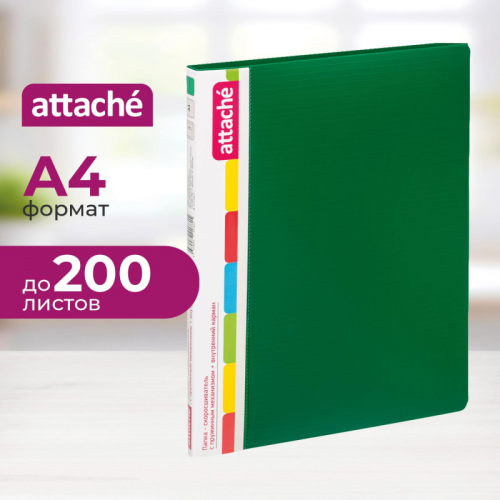 Скоросшиватель с пружинным механизмом Attache используется для хранения различного рода документации, для ведения документооборота, систематизации договоров, других важных бумаг. Формат А4. Папка изготовлена из пропилена толщиной 0,7 мм. Имеет прозрачный карман на левой внутренней обложке для документов. Ширина корешка - 16 мм, вместимость - 200 листов стандартной плотности. Цвет - зеленый. 1.положите скоросшиватель на горизонтальную поверхность, откройте его; 2.большим и указательным пальцами придайте пружинам вертикальное положение; 3.снимите планку со штырей движением вверх; 4.поместите перфорированные листы внутрь папки на штырьки-пружины; 5.поверх листов разместите ранее снятую планку, прижмите ее к бумаге; 6.с помощью большого и указательного пальцев разведите штырьки-пружины в противоположные направления.