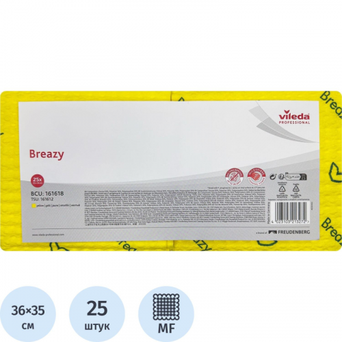 Салфетки хозяйственные Vileda Professional Бризи микрофибра 36х35см 105 г/кв. м жёлтые (25 штук в упаковке).Уникальная запатентованная салфетка Бризи от Vileda Professional со структурированной поверхностью предназначена для профессиональной уборки и протирки поверхностей, сбора мусора разного размера и влаги одновременно. Идеально подходит для применения в ресторанах, барах и кафе.Для удобства уборки салфетки представлены в четырёх цветах: синий (арт. 1104461), красный (арт. 1104462), жёлтый (арт. 1104463), зелёный (арт. 1104464).Салфетка Бризи быстро и эффективно очищает от пыли и сора разного размера, собирает малое количество влаги. Подходит для уборки любых горизонтальных и вертикальных типов поверхностей, таких как столы и столешницы, полки, выступы, шкафы, стойки, поверхности в санузлах.Особенности и преимущества:- запатентованная поверхность с волнообразной структурой позволяет подбирать на 40 % больше мусора по сравнению с обычной гладкой салфеткой;- за счёт увеличенного содержания микроволокна в структуре материала, позволяет удалять бактерии с убираемых поверхностей;- салфетки Бризи убирают до 99,99 % бактерий с поверхности без использования дезинфектанта;- мультифункциональная: хорошо собирает влагу и загрязнения;- в сухом виде отлично собирает сыпучий мусор, например, крошки;- мягкая на ощупь и объёмная в руке;- 4 ярких цвета для цветовой кодировки и исключения перекрёстных загрязнений;- салфетка рекомендована к использованию как однодневная, но также способна выдерживать машинные стирки.Продукт произведён в Германии. Область применения:Идеальна для уборки предприятий общественного питания в сегменте HoReCa: отели, рестораны, кафе, бары, столовые, кейтеринг. Подходит для профессионального клининга в частной и коммерческой недвижимости.Салфетка Бризи - это высококачественный инструмент для эффективной, экологичной и профессиональной уборки.Характеристики:- размер: 36x35 см;- толщина: 3,6 мм;- вес: 34,6 г;- максимальная впитываемость в сухом состоянии: 600 % от собственного веса;- состав: 50 % вискоза, 30 % микроволокно полиэстеровое, 20% полипропилен;- количество машинных стирок: до 100 при температуре 60 C и соблюдении рекомендаций Vileda Professional;- количество штук в упаковке: 25 шт.