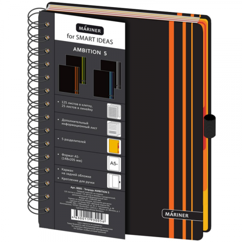 Бизнес - тетрадь А5/150л.+ дополн. лист, информационный лист на спирали - мелованная бумага, печать 4+0, располагается поверх верхней обложки. Обложка- твердый переплет на спирали, глянцевая ламинация, по 4 дизайна в ассортименте. Форзац - офсетная бумага, печать 1+0 (черный). Размер внутреннего блока - 148х205мм., бумага 60г/м, белизна 100%, клетка 125л. + 25 л. линейка, 5 вертикальных разделителей, картон 200 г/м, на нижней обложке с внутренней стороны кармашек для мелочей, резинка под ручку, каждое изделие упаковано в термоусадочную пленку.