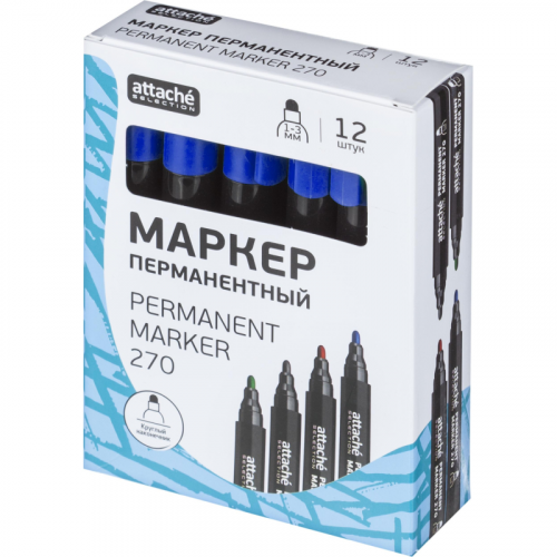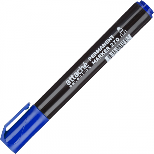 Маркер перманентный Attache Selection в прочном пластиковом корпусе. Нестираемые светостойкие чернила на спиртовой основе, не содержат ксилол и толуол. Идеально подходит для надписей на металле, пластике, дереве и картоне, а также резине, стекле, камне, кирпиче, бетоне, пленке. Прочный акриловый наконечник круглой формы позволяет провести линию толщиной от 1 до 3 мм. Цвет - синий. Длина линии письма - 500 м.