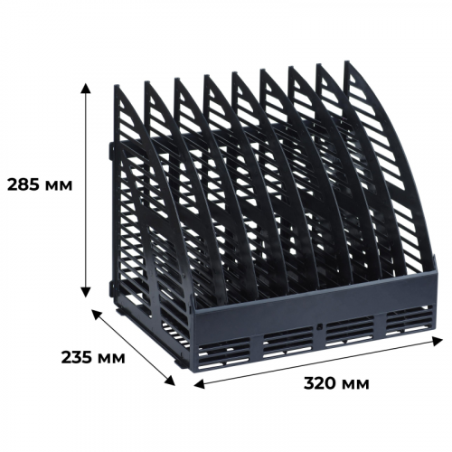 Вертикальный накопитель Attache выполнен из пластика черного цвета. Минималистичный дизайн лотка создаст на Вашем рабочем месте ощущение легкости. Не занимает много места на рабочем столе. Позволяет удобно хранить документы и печатную продукцию формата А4. Имеет 8 отделений. Размеры изделия (ДxШxВ): 235x320x285 мм. Внутренняя ширина: 320 мм, внешняя ширина по выступающим деталям: 335 мм. Вес: 860 г. Конструкция требует самостоятельной сборки, что позволяет регулировать ширину отделения кратно 40 мм. Съемный передний бортик. Возможно крепление на вертикальных плоскостях. Обладает устойчивой конструкцией, благодаря которой является удобным для хранения большого объема документов. Этикетки для маркировки в комплект поставки не входят