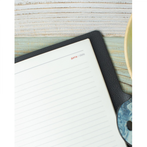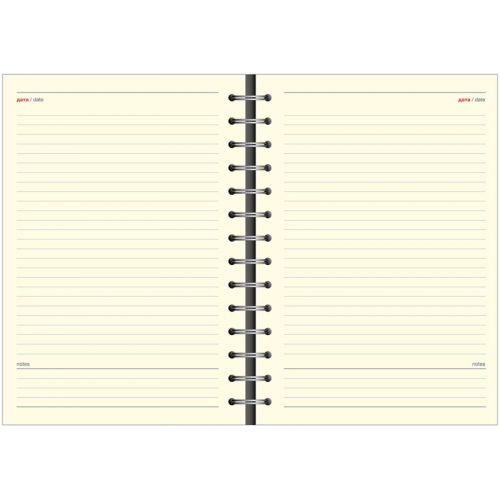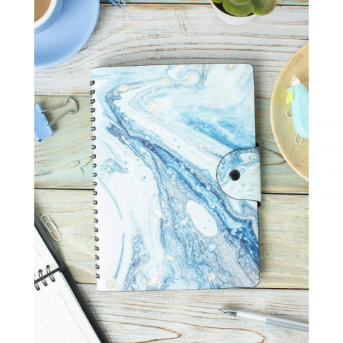 Легкий недатированный ежедневник Attache Selection из коллекции ''Fluid'' А5 формата (140x200 мм) на спирали в креативном дизайне и серо-голубом цвете будет не только незаменимым помощником в ведении дел, но и станет стильным аксессуаром, отражающим индивидуальность владельца. Мягкая обложка из приятной искусственной кожи имеет скругленные уголки и фигурный клапан на кнопке, который не позволит растрепаться страницам. Удобное крепление на полускрытой спирали позволит удалять ненужные листы, не повредив при этом сам блок. Недатированный внутренний блок в линейку на 96 листов (192 страницы) - из высококачественной бумаги цвета слоновой кости плотностью 70-90 г/кв.м. с прямыми уголками. Информационный блок ежедневника включает в себя: титульный лист, планер на каждый месяц и развороты для заметок в начале и конце блока.
