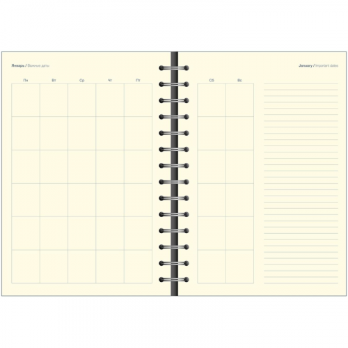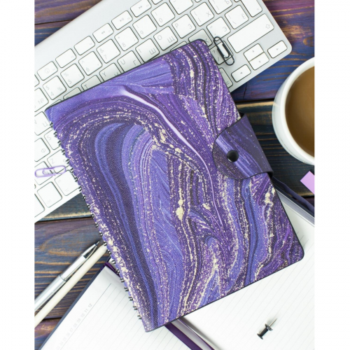 Легкий недатированный ежедневник Attache Selection из коллекции ''Fluid'' А5 формата (140x200 мм) на спирали в креативном дизайне и фиолетовом цвете будет не только незаменимым помощником в ведении дел, но и станет стильным аксессуаром, отражающим индивидуальность владельца. Мягкая обложка из приятной искусственной кожи имеет скругленные уголки и фигурный клапан на кнопке, который не позволит растрепаться страницам. Удобное крепление на полускрытой спирали позволит удалять ненужные листы, не повредив при этом сам блок. Недатированный внутренний блок в линейку на 96 листов (192 страницы) - из высококачественной бумаги цвета слоновой кости плотностью 70-90 г/кв.м. с прямыми уголками. Информационный блок ежедневника включает в себя: титульный лист, планер на каждый месяц и развороты для заметок в начале и конце блока.