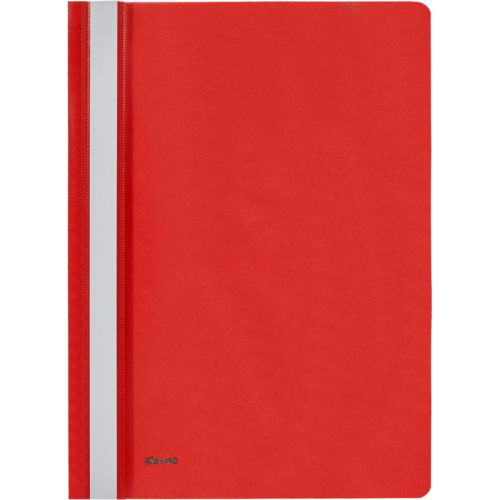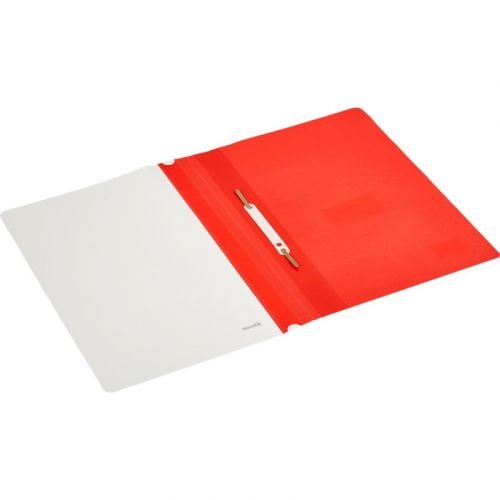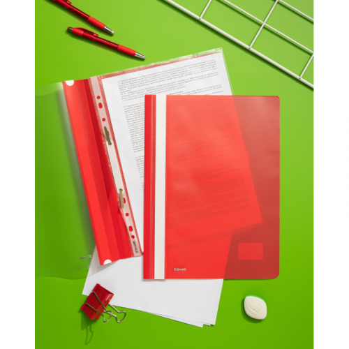 Скоросшиватель используется для хранения различного рода документации, для ведения документооборота, систематизации договоров, других важных бумаг. Папка изготовлена из гладкого пластика. Толщина верхнего прозрачного листа - 130 мкм, нижнего цветного листа - 180 мкм. С прозрачной верхней обложкой. На лицевой стороне находится карман с белым бумажной полосой для указания содержания, вместимость - 100 листов стандартной плотности. Цвет- красный