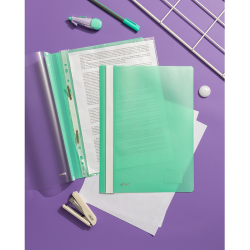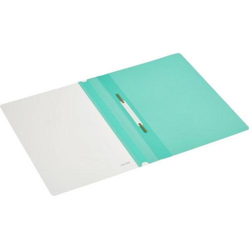 Скоросшиватель используется для хранения различного рода документации, для ведения документооборота, систематизации договоров, других важных бумаг. Папка изготовлена из гладкого пластика. Толщина верхнего прозрачного листа - 130 мкм, нижнего цветного листа - 180 мкм. С прозрачной верхней обложкой. На лицевой стороне находится карман с белым бумажной полосой для указания содержания, вместимость - 100 листов стандартной плотности. Цвет- бирюзовый