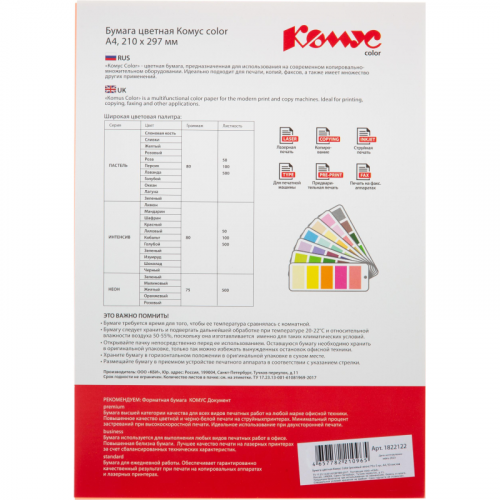Цветная бумага для офиса Комус Color A4 предназначена для печати на всех видах оргтехники и ризографах. Идеально подходит для документов, презентаций, рекламных материалов, открыток. Одна пачка содержит 50 листов формата А4, плотность которых составляет 75 г/кв.м. Упакована в прозрачные пакеты с многоразовым клапаном. Рекомендована ведущими производителями офисной техники. В зависимости от партии сырья оттенок может меняться. Цветопередача монитора может искажать реальный цвет продукта. Страна производства - Китай.Законодательные и технические документы