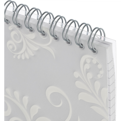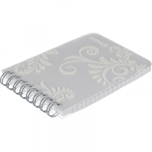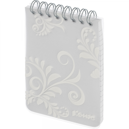 Блокнот Комус Русская серия с пластиковой обложкой. Формат А7, белый цвет. Обложка изготовлена из высококачественного плотного матового пластика с нанесением глянцевого контрастного узора. Благодаря такой обложке, блокнот крайне износостоек при этом достаточно гибок. В блокноте 50 листов в клетку. Блок изготавливается из эстрабелой плотной бумаги. Размер блока - 76x105 мм. Для более эргономичного использования, разлиновка четко запечатана с идеальным совмещениеем и полями. Крепление на евроспираль, исключающую самопроизвольное выпадение листов.