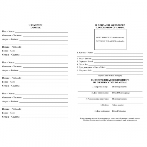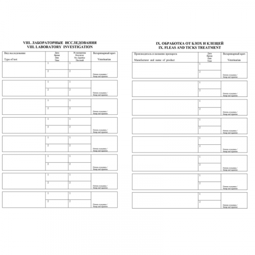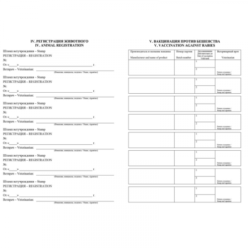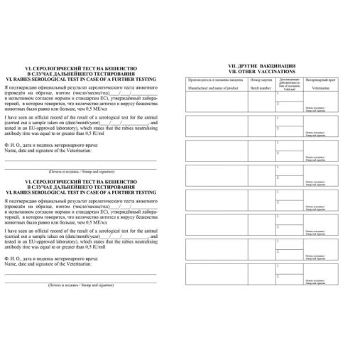 Ветеринарный паспорт - это документ, в котором содержится информация о питомце и его владельце. Паспорт оформляется врачом-ветеринаром. Разделы для заполнения: I. ВЛАДЕЛЕЦ. II. ОПИСАНИЕ ЖИВОТНОГО. III. ИДЕНТИФИКАЦИЯ ЖИВОТНОГО IV. РЕГИСТРАЦИЯ ЖИВОТНОГО. V. ВАКЦИНАЦИЯ ПРОТИВ БЕШЕНСТВА. VI. СЕРОЛОГИЧЕСКИЙ ТЕСТ НА БЕШЕНСТВО В СЛУЧАЕ ДАЛЬНЕЙШЕГО ТЕСТИРОВАНИЯ. VII. ДРУГИЕ ВАКЦИНАЦИИ. VIII. ДЕГЕЛЬМИНТИЗАЦИЯ. IX. ЛАБОРАТОРНЫЕ ИССЛЕДОВАНИЯ. X. ОБРАБОТКА ОТ БЛОХ И КЛЕЩЕЙ. XI. КЛИНИЧЕСКИЙ ОСМОТР. XII. ВЕТЕРИНАРНОЕ УДОСТОВЕРЕНИЕ. XIII. РЕПРОДУКЦИЯ. XIV. ДЛЯ ЗАМЕТОК. Паспорт формата А5, размером 140х195 мм. Обложка цветная, из мелованной бумаги 180 г/кв. м. с припрессовкой глянцевой пленки. Внутренний блок - 10 листов из офсетной бумаги 65 г/кв. м. Переплет мягкий, на скрепке.