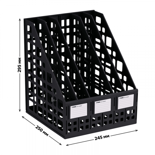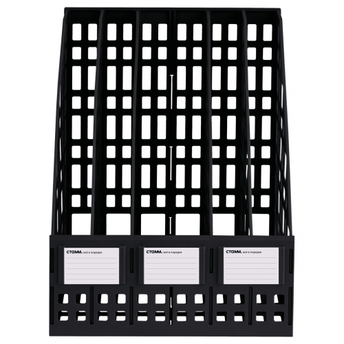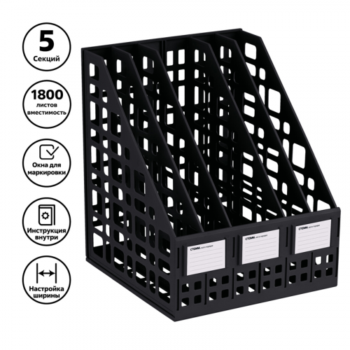 Лоток вертикальный сборный 5 отделений "СТАММ" предназначен для хранения и систематизации бумажной продукции формата А4. Современный дизайн, быстрая и легкая сборка. Удобная конструкция предусматривает регулировку ширины отделений. Передняя стенка имеет окна для маркировки, предусматривающие возможность смены вкладышей. Изготовлен из качественного пластика. Упакован в термоусадочную пленку, поставляется в разобранном виде. Инструкция по сборке и три бумажных вкладыша в комплекте. Цвет лотка - черный. Изделие высотой 295мм, глубиной 250мм , шириной 245мм вмещает до 1800 листов.