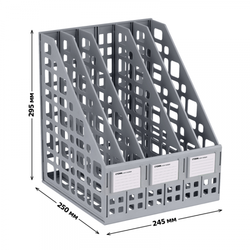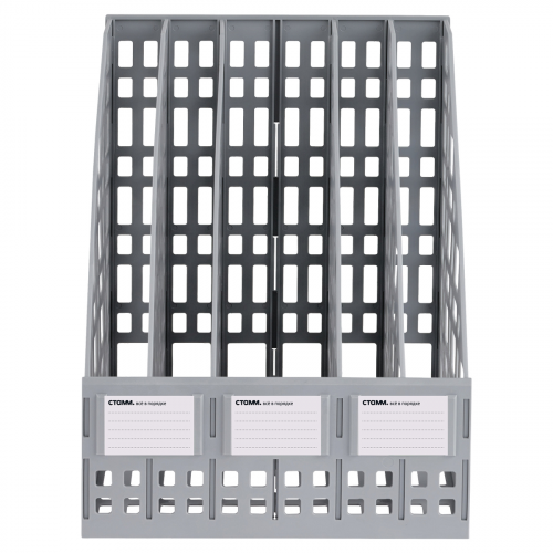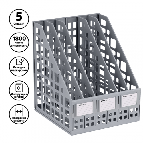 Лоток вертикальный сборный 5 отделений "СТАММ" предназначен для хранения и систематизации бумажной продукции формата А4. Современный дизайн, быстрая и легкая сборка. Удобная конструкция предусматривает регулировку ширины отделений. Передняя стенка имеет окна для маркировки, предусматривающие возможность смены вкладышей. Изготовлен из качественного пластика. Упакован в термоусадочную пленку, поставляется в разобранном виде. Инструкция по сборке и три бумажных вкладыша в комплекте. Цвет лотка - серый. Изделие высотой 295мм, глубиной 250мм , шириной 245мм вмещает до 1800 листов.