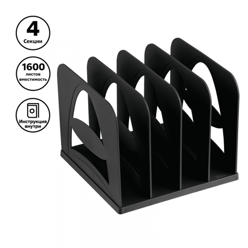 Лоток-сортер сборный 4 отделения "СТАММ" предназначен для бумажной продукции формата А4. Современный дизайн, быстрая и легкая сборка. Удобная конструкция предусматривает регулировку ширины отделений. Резиновые ножки препятствуют скольжению. Изготовлен из качественного пластика. Упакован в термоусадочную пленку, поставляется в разобранном виде. Инструкция по сборке в комплекте. Цвет лотка - черный. Изделие высотой 170, глубиной 210, шириной 210 вмещает 1600 листов.