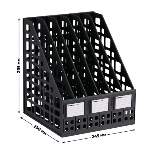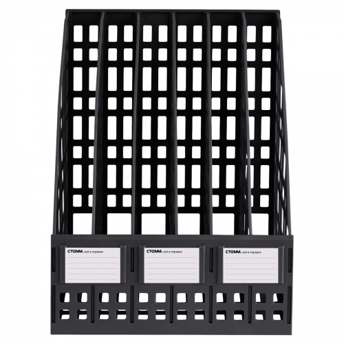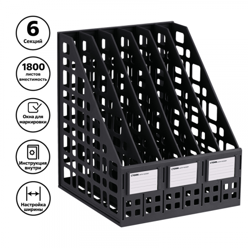 Лоток вертикальный сборный 6 отделений "СТАММ" предназначен для хранения и систематизации бумажной продукции формата А4. Современный дизайн, быстрая и легкая сборка. Удобная конструкция предусматривает регулировку ширины отделений. Передняя стенка имеет окна для маркировки, предусматривающие возможность смены вкладышей. Изготовлен из качественного пластика. Упакован в термоусадочную пленку, поставляется в разобранном виде. Инструкция по сборке и три бумажных вкладыша в комплекте. Цвет лотка - черный. Изделие высотой 295мм, глубиной 250мм , шириной 245мм вмещает до 1800 листов.