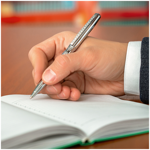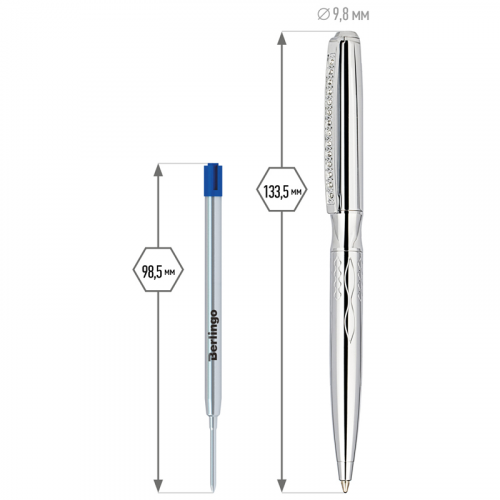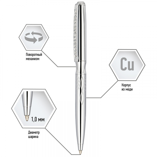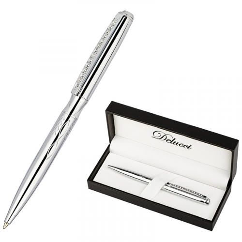 Delucci Mare – это роскошная подарочная шариковая ручка с синими чернилами, которую оценит любой человек. Серебристый корпус украшен изогнутыми линиями, тонкий и аккуратный клип инкрустирован кристаллами. В составе клипа – нержавеющая сталь, он также позволит использовать ручку с комфортом: закреплять ее в удобном месте. Delucci Mare оснащена поворотным механизмом, внутри которого расположен пишущий стержень диаметром 1 мм, который идеально подходит для быстрого стиля письма. Упакована в футляр с откидной крышкой.