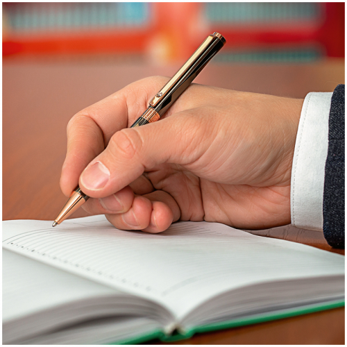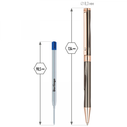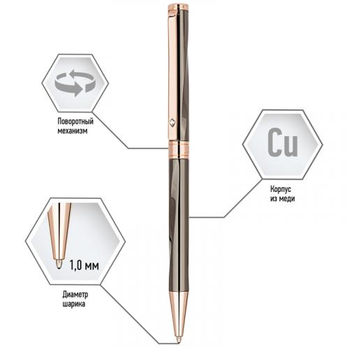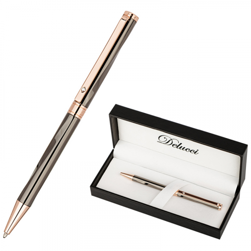 Delucci Inno – это необычная подарочная шариковая ручка с синими чернилами, которая впечатлит вас. Корпус цвета оружейного металла с золотыми вставками дополняет аккуратный клип с небольшим кристаллом в виде ромба. Ручка отличается оригинальным рифлением, которое создает красивые впадины. Клип сделан из нержавеющей стали, он позволяет фиксировать ручку на ежедневниках, блокнотах и карманах одежды. Delucci Inno оснащена поворотным механизмом, внутри которого расположен пишущий стержень диаметром 1 мм, который идеально подходит для быстрого стиля письма. Упакована в кожаный футляр.