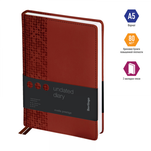Стильный недатированный ежедневник Berlingo Vivella Prestige формата А5 с классической твердой матовой обложкой из высококачественной экокожи. Имиджевое тиснение на обложке добавляет интересную деталь в насыщенный коричневый цвет. Внутренний блок состоит из 160 листов высококачественной белой бумаги повышенной плотности 80 г/м² с пантонной печатью в 2 краски. Недатированный ежедневник Berlingo Vivella Prestige представлен в размере 150 на 215 мм.
