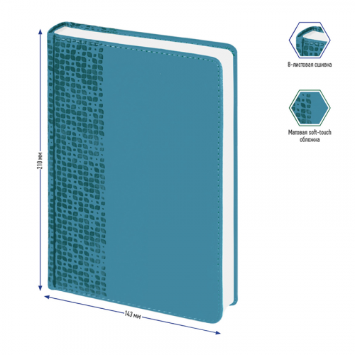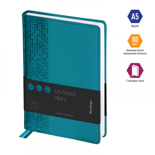 Стильный недатированный ежедневник Berlingo Vivella Prestige формата А5 с классической твердой матовой обложкой из высококачественной экокожи. Имиджевое тиснение на обложке добавляет интересную деталь в необычный аквамариновый цвет. Внутренний блок состоит из 160 листов высококачественной белой бумаги повышенной плотности 80 г/м² с пантонной печатью в 2 краски. Недатированный ежедневник Berlingo Vivella Prestige представлен в размере 150 на 215 мм.