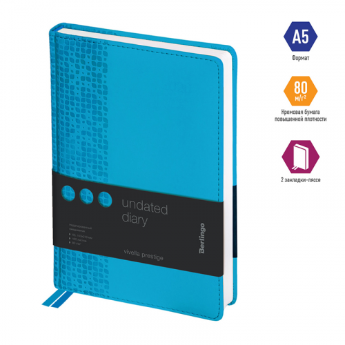 Стильный недатированный ежедневник Berlingo Vivella Prestige формата А5 с классической твердой матовой обложкой из высококачественной экокожи. Имиджевое тиснение на обложке добавляет интересную деталь в нежный голубой цвет. Внутренний блок состоит из 160 листов высококачественной белой бумаги повышенной плотности 80 г/м² с пантонной печатью в 2 краски. Недатированный ежедневник Berlingo Vivella Prestige представлен в размере 150 на 215 мм.