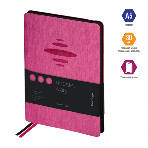Стильный недатированный ежедневник Berlingo Color Zone формата А5 с ультрамягкой обложкой из экокожи. Обложка с тиснением цвета фуксии ярко контрастирует с черным срезом. Для удобства внутри корешка расположен специальный карман для ручки, ежедневник можно зафиксировать вертикальной резинкой. Внутренний блок состоит из 136 листов высококачественной кремовой бумаги повышенной плотности 80 г/м² с пантонной печатью в 2 краски. Недатированный ежедневник Berlingo Color Zone представлен в размере 143 на 210 мм.
