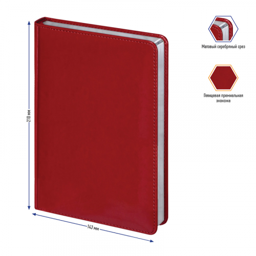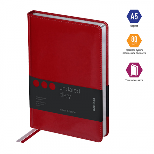 Глянцевый недатированный ежедневник Berlingo Silver Pristine формата А5 с твердой обложкой из экокожи и поролоновой прослойкой идеален для повседневного использования. Сочетание серебряного фольгированного среза и красной обложки делает ежедневник элегантной деталью делового образа. Внутренний блок состоит из 160 листов высококачественной кремовой бумаги повышенной плотности 80 г/м² с пантонной печатью в 2 краски. Размер недатированного ежедневника – 143 на 210 мм.
