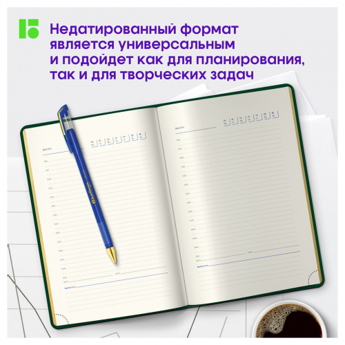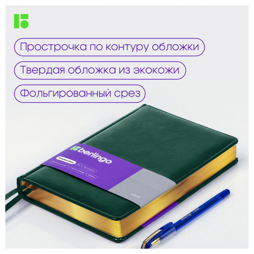 Оригинальный недатированный ежедневник Berlingo xGold формата А5 с твердой обложкой из экокожи и поролоновой прослойкой понравится каждому. Золотой фольгированный срез красиво подчеркивает глубокий зеленый цвет обложки. Внутренний блок состоит из 160 листов высококачественной кремовой бумаги повышенной плотности 80 г/м² с пантонной печатью в 2 краски. Размер недатированного ежедневника – 150 на 215 мм.