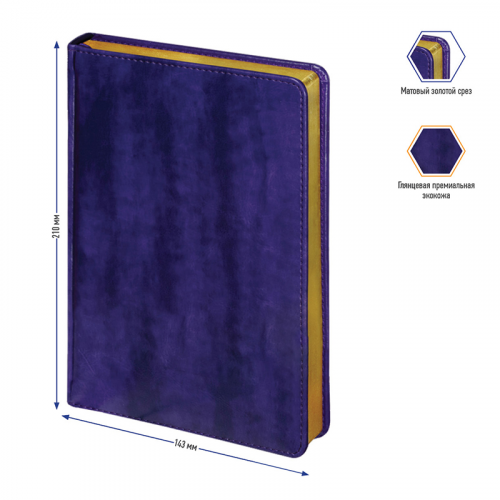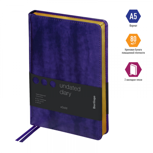 Оригинальный недатированный ежедневник Berlingo xGold формата А5 с твердой обложкой из экокожи и поролоновой прослойкой понравится каждому. Золотой фольгированный срез красиво подчеркивает глубокий фиолетовый цвет обложки. Внутренний блок состоит из 160 листов высококачественной кремовой бумаги повышенной плотности 80 г/м² с пантонной печатью в 2 краски. Размер недатированного ежедневника – 150 на 215 мм.