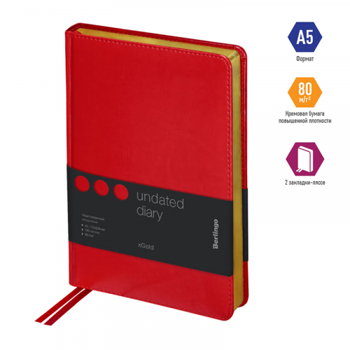 Оригинальный недатированный ежедневник Berlingo xGold формата А5 с твердой обложкой из экокожи и поролоновой прослойкой понравится каждому. Золотой фольгированный срез красиво подчеркивает глубокий красный цвет обложки. Внутренний блок состоит из 160 листов высококачественной кремовой бумаги повышенной плотности 80 г/м² с пантонной печатью в 2 краски. Размер недатированного ежедневника – 150 на 215 мм.