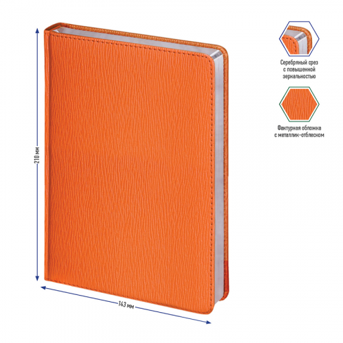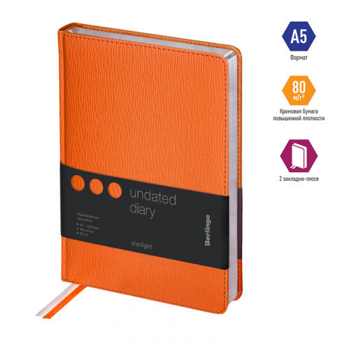 Оригинальный недатированный ежедневник Berlingo Starlight формата А5 с твердой блестящей обложкой из экокожи и поролоновой прослойкой идеально подойдет в качестве подарка. Серебряный фольгированный срез красиво подчеркивает яркий оранжевый цвет обложки с продольной текстурой. Внутренний блок состоит из 160 листов высококачественной кремовой бумаги повышенной плотности 80 г/м² с пантонной печатью в 2 краски. Размер недатированного ежедневника – 150 на 215 мм.