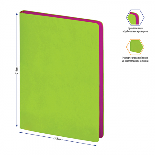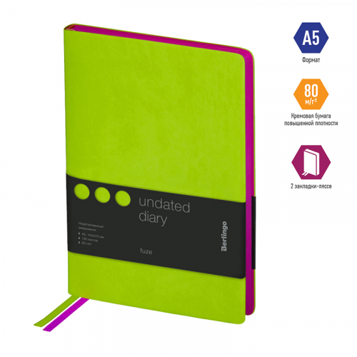 Стильный недатированный ежедневник Berlingo Fuze формата А5 с ультрамягкой обложкой из экокожи. Обложка салатового цвета ярко контрастирует со срезом цвета фуксии. Внутренний блок состоит из 136 листов высококачественной кремовой бумаги повышенной плотности 80 г/м² с пантонной печатью в 2 краски. Недатированный ежедневник Berlingo Fuze представлен в размере 143 на 210 мм.