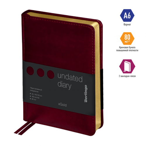 Компактный недатированный ежедневник Berlingo xGold формата А6 с твердой обложкой из экокожи и поролоновой прослойкой идеален для повседневного использования. Золотой фольгированный срез красиво подчеркивает глубокий бордовый цвет обложки. Внутренний блок состоит из 160 листов высококачественной кремовой бумаги повышенной плотности 80 г/м² с пантонной печатью в 2 краски. Размер недатированного ежедневника – 110 на 155 мм.