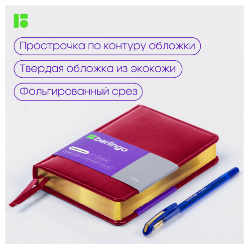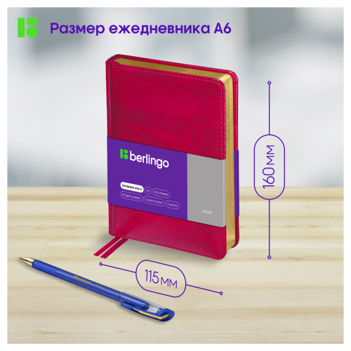 Компактный недатированный ежедневник Berlingo xGold формата А6 с твердой обложкой из экокожи и поролоновой прослойкой идеален для повседневного использования. Золотой фольгированный срез красиво подчеркивает обложку цвета сочной фуксии. Внутренний блок состоит из 160 листов высококачественной кремовой бумаги повышенной плотности 80 г/м² с пантонной печатью в 2 краски. Размер недатированного ежедневника – 110 на 155 мм.