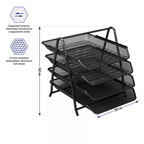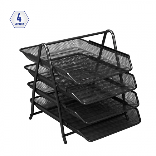 Стильный и практичный горизонтальный лоток с 4 секциями из высококачественного материала. Предназначен для удобного хранения бумажной продукции формата А4. Позволяет легко и эффективно организовать рабочее место. Лотки могут использоваться отдельно от опоры. Выдвижной механизм обеспечивает легкий доступ к содержимому лотков. Легкая и быстрая сборка. Черный цвет. Прочный корпус из высококачественного металла. Сетчатое исполнение предотвращает образование пыли внутри. Упаковка в картонную лакированную коробку.