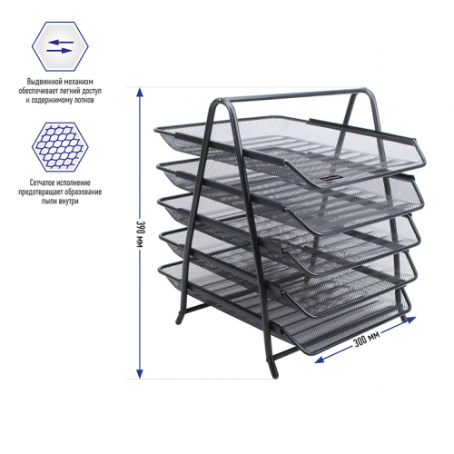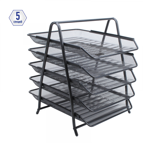 Стильный и практичный горизонтальный лоток с 5 секциями из высококачественного материала. Предназначен для удобного хранения бумажной продукции формата А4. Позволяет легко и эффективно организовать рабочее место. Лотки могут использоваться отдельно от опоры. Выдвижной механизм обеспечивает легкий доступ к содержимому лотков. Легкая и быстрая сборка. Черный цвет. Прочный корпус из высококачественного металла. Сетчатое исполнение предотвращает образование пыли внутри. Упаковка в картонную лакированную коробку.