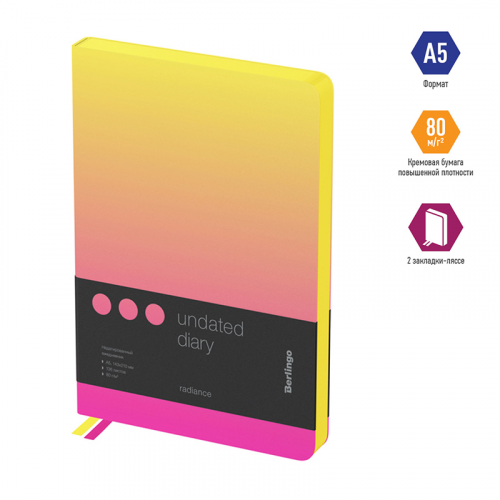Стильный недатированный ежедневник Berlingo Radiance формата A5 с ярким цветным контрастным срезом и ультрамягкой обложкой из высококачественной экокожи. Насыщенный розово-желтый градиент стильно сочетается со срезом желтого цвета. Внутренний блок состоит из 136 листов высококачественной кремовой бумаги повышенной плотности 80 г/м² с пантонной печатью в 2 краски. Недатированный ежедневник Berlingo Radiance представлен в размере 143 на 210 мм.