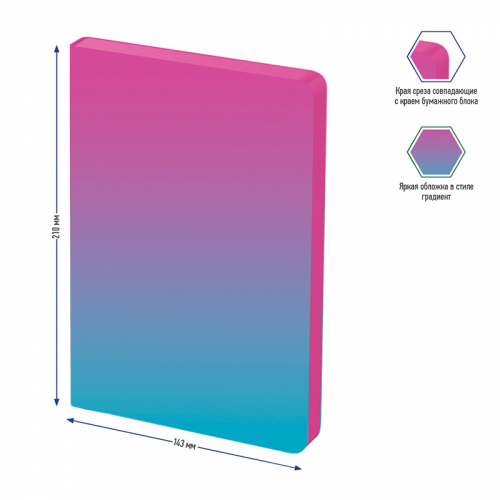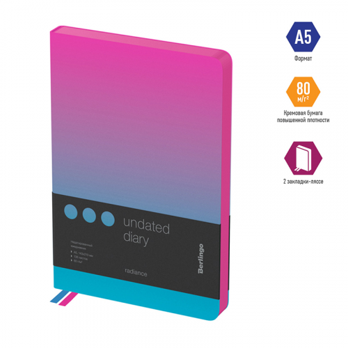 Стильный недатированный ежедневник Berlingo Radiance формата A5 с ярким цветным контрастным срезом и ультрамягкой обложкой из высококачественной экокожи. Насыщенный розово-голубой градиент стильно сочетается с розовым срезом. Внутренний блок состоит из 136 листов высококачественной кремовой бумаги повышенной плотности 80 г/м² с пантонной печатью в 2 краски. Недатированный ежедневник Berlingo Radiance представлен в размере 143 на 210 мм.