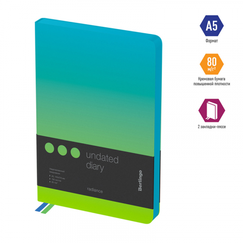 Стильный недатированный ежедневник Berlingo Radiance формата A5 с ярким цветным контрастным срезом и ультрамягкой обложкой из высококачественной экокожи. Насыщенный зелено-голубой градиент стильно сочетается с голубым срезом. Внутренний блок состоит из 136 листов высококачественной кремовой бумаги повышенной плотности 80 г/м² с пантонной печатью в 2 краски. Недатированный ежедневник Berlingo Radiance представлен в размере 143 на 210 мм.