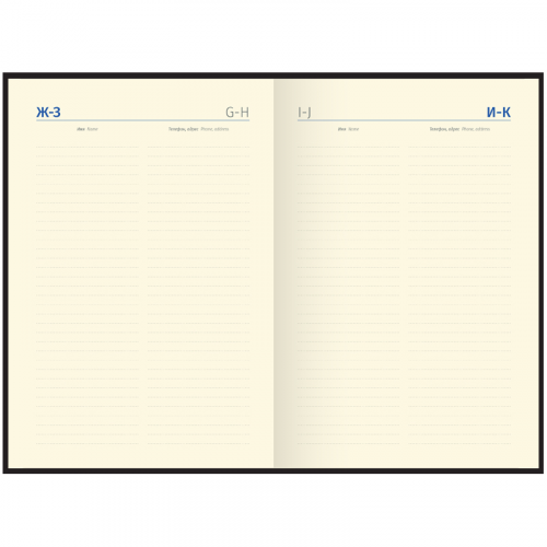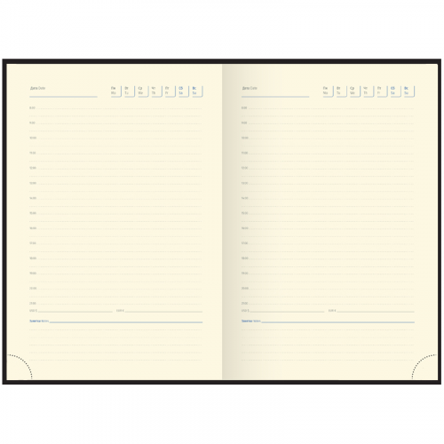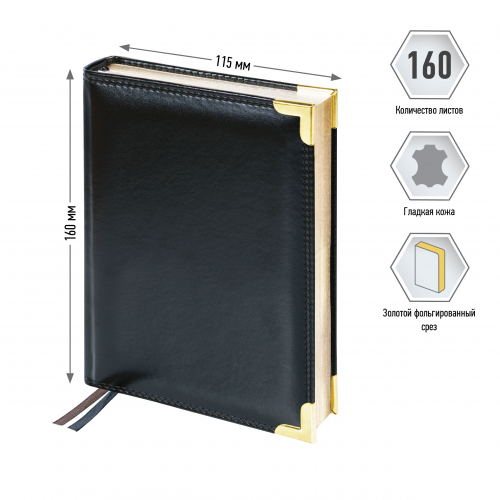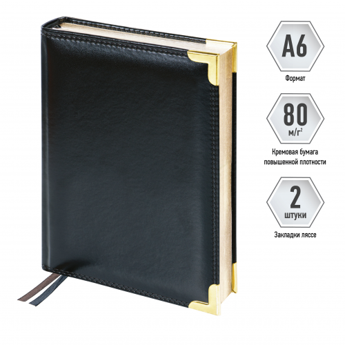 Изысканный недатированный ежедневник Delucci формата А6 из первоклассной гладкой экокожи и поролоновой прослойкой – идеальный презент для руководителя. Черная обложка прошита двойной строчкой, её дополняют золотые металлические уголки и необычный золотой срез блока. Внутренний блок состоит из 160 листов кремовой бумаги повышенной плотности 100 г/м² с пантонной печатью в 2 краски. Недатированный ежедневник Delucci представлен в размере 115 на 160 мм. Перфорированные уголки и 2 закладки-ляссе сделают использование комфортным. Внутри располагается справочный материал, отрывные заметки и бланки-извещения о ДТП. 3 комплекта стикеров станут приятным подарком. Подарочная матовая индивидуальная упаковка. • Формат: A6; • Размер: 115*160 мм; • Материал обложки: экокожа; • Цвет обложки: чёрный.