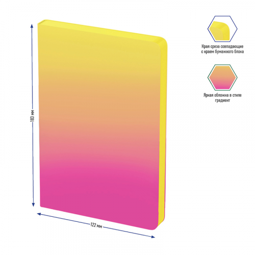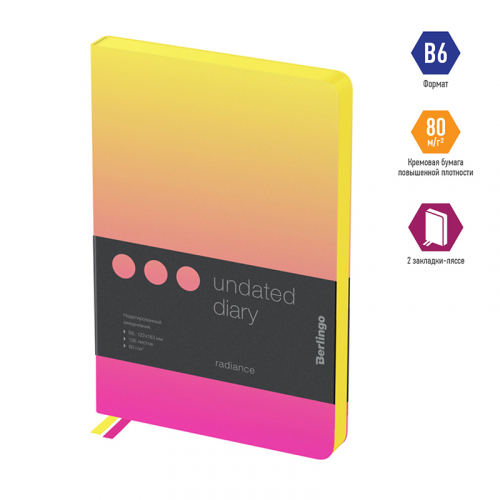 Стильный недатированный ежедневник Berlingo Radiance формата B6 с ярким цветным контрастным срезом и ультрамягкой обложкой из высококачественной экокожи. Насыщенный розово-желтый градиент стильно сочетается со срезом желтого цвета. Внутренний блок состоит из 136 листов высококачественной кремовой бумаги повышенной плотности 80 г/м² с пантонной печатью в 2 краски. Недатированный ежедневник Berlingo Radiance представлен в размере 122 на 183 мм.