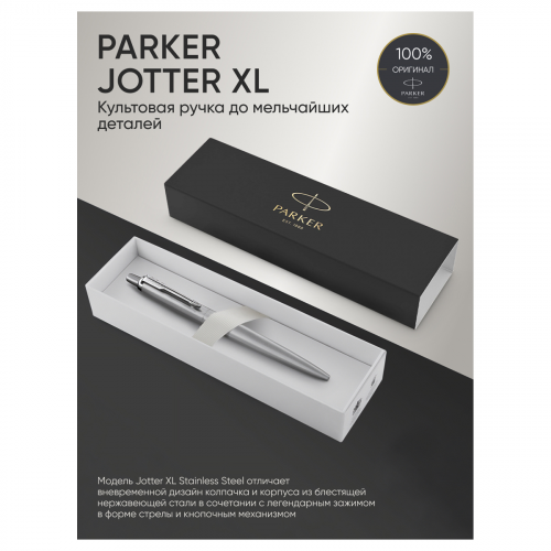 Ручка шариковая Parker "Jotter XL Monochrome 2020 GREY " синяя, 1,0мм, кнопочн., подар. уп., в отделке корпуса используется нержавеющая сталь. ВНИМАНИЕ! С марта 2020г. подарочные коробки ручек ТМ Parker прекратили комплектоваться лифлетами (листовками с гарантийным талоном).