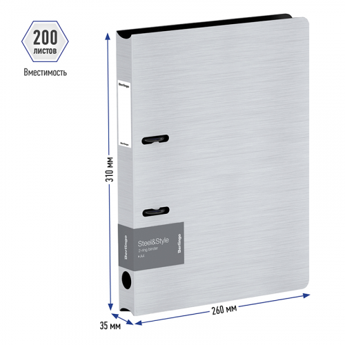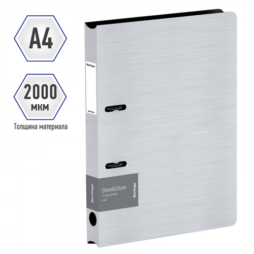 Папка на 2-х кольцах Berlingo серии Steel&Style формата А4 - замечательный аксессуар для офиса и учёбы, выполненный в классическом офисном стиле. Увеличенная толщина обложки из полифома - 2000 мкм. Белый цвет внешней стороны в сочетании с фактурой "сталь", а также чёрный цвет внутренней поверхности. Ширина корешка составляет 35 мм. Специальная D-форма колец помогает удобно и ровно хранить документы, которые могут быть выровнены по левому краю, благодаря боковой вертикальной стенке кольца. Кольца диаметром 25 мм и фурнитура тоже выполнены в чёрном цвете. Вместимость папки – 200 листов. Специальные формовые отверстия в обложке служат для надежного защелкивания папки в сложенном виде, предотвращают случайное открытие обложки и замятие документов внутри при хранении и транспортировке. Специальная наклейка на корешке, позволяющая делать пометки о содержимом, в комплекте есть дополнительная наклейка. Папка может использоваться как регистратор и устойчиво храниться в вертикальном положении. Эргономичная круглая вырубка в корешке для быстрого извлечения папки из хранилища. Размер папки составляет 310*260*35 мм. Упакована в индивидуальный пакет с липким краем.