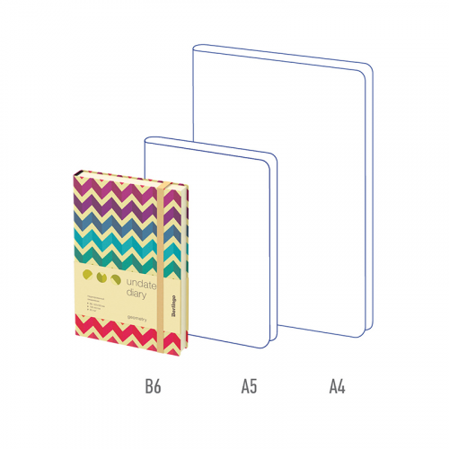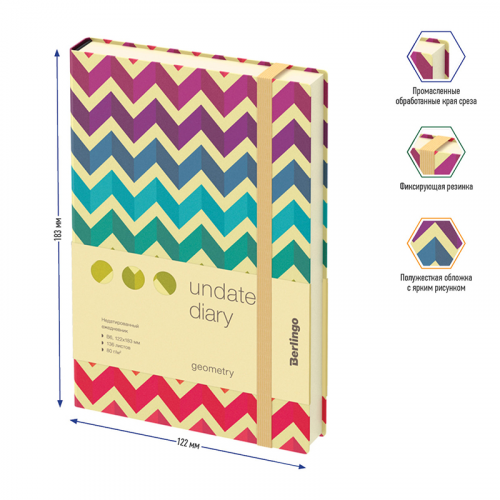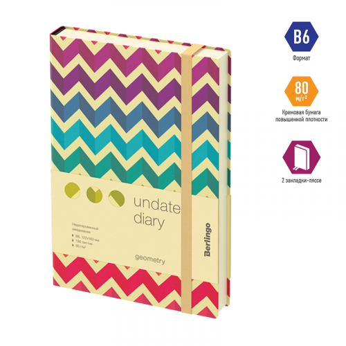 Стильный недатированный ежедневник Berlingo Geometry формата B6 с разноцветной полужёсткой обложкой из высококачественной экокожи. Яркие графические элементы создают необычный геометрический узор на обложке. Внутренний блок состоит из 136 листов высококачественной кремовой бумаги повышенной плотности 80 г/м² с пантонной печатью в 2 краски. Недатированный ежедневник Berlingo Geometry представлен в размере 143 на 210 мм.