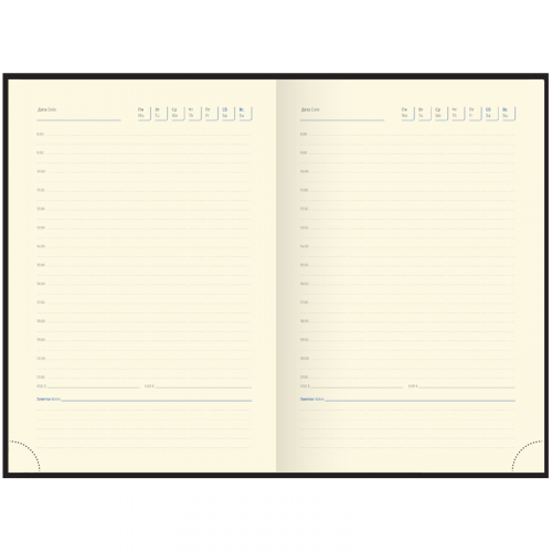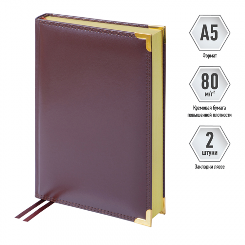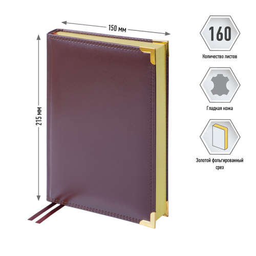 Изысканный недатированный ежедневник Delucci формата А5 из первоклассной гладкой экокожи и поролоновой прослойкой – идеальный презент для руководителя. Коричневая обложка прошита двойной строчкой, её дополняют золотые металлические уголки и необычный золотой срез блока. Внутренний блок состоит из 160 листов кремовой бумаги повышенной плотности 100 г/м² с пантонной печатью в 2 краски. Недатированный ежедневник Delucci представлен в размере 150 на 215 мм.