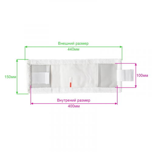 Тип насадки: плоская для складного флаундера. Материал: микрофибра. Крепление насадки: уши и карманы. Максимальный объем впитывания: 870 мл. Размер насадки внешний: 44 х 15 см. Размер насадки внутренний: 40 х 10 см. Длина ворса: 0,5 см. Цвет: белый. Вес: 115 г. Подходит к швабрам (Код: 266755, 266756, 303072, 303073) и флаундеру (Код: 266764).
