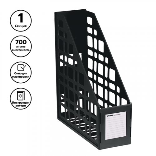 Лоток вертикальный сборный "СТАММ" предназначен для хранения и систематизации бумажной продукции формата А4. Современный дизайн, быстрая и легкая сборка. Удобная конструкция предусматривает регулировку ширины отделений. Передняя стенка имеет окна для маркировки, предусматривающие возможность смены вкладышей. Изготовлен из качественного пластика. Упакован в термоусадочную пленку, поставляется в разобранном виде. Инструкция по сборке в комплекте. Цвет лотка - черный. Изделие высотой 295мм, глубиной 250мм , шириной 90мм вмещает до 700 листов.